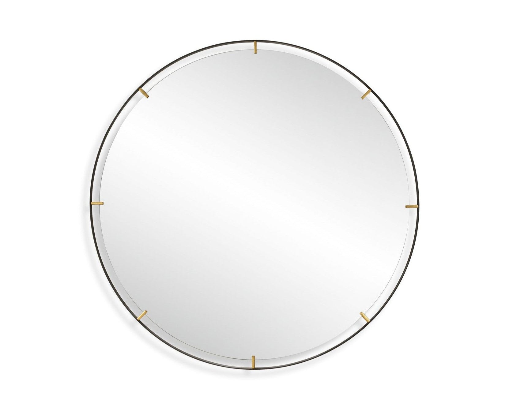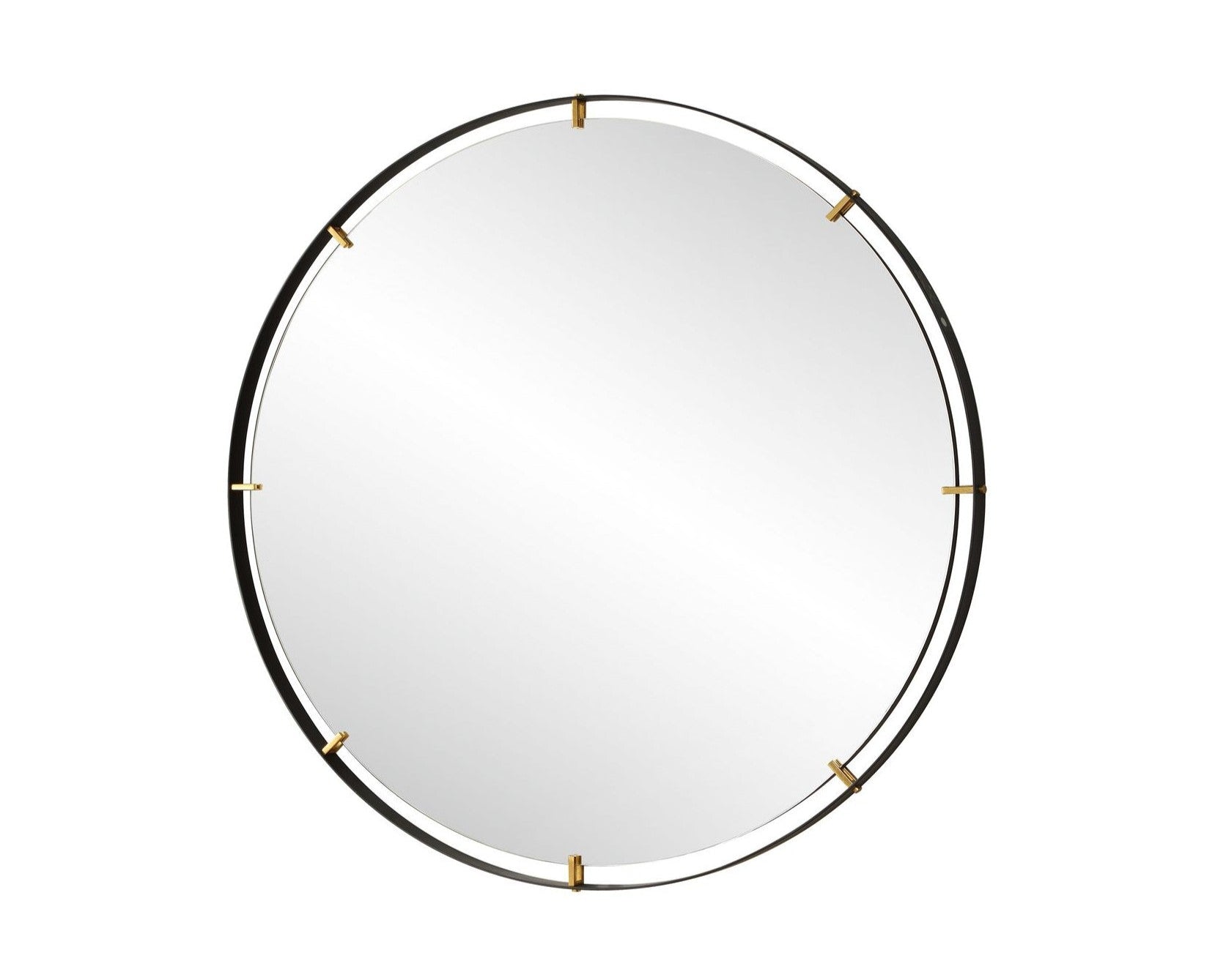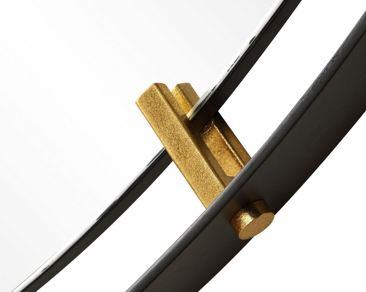 Elevate your home decor with our Grand Pendulum Round mirror. Crafted with a hefty black iron frame accented by lightly antiqued gold clips that help suspend a polished edge mirror for a statement piece in any room.