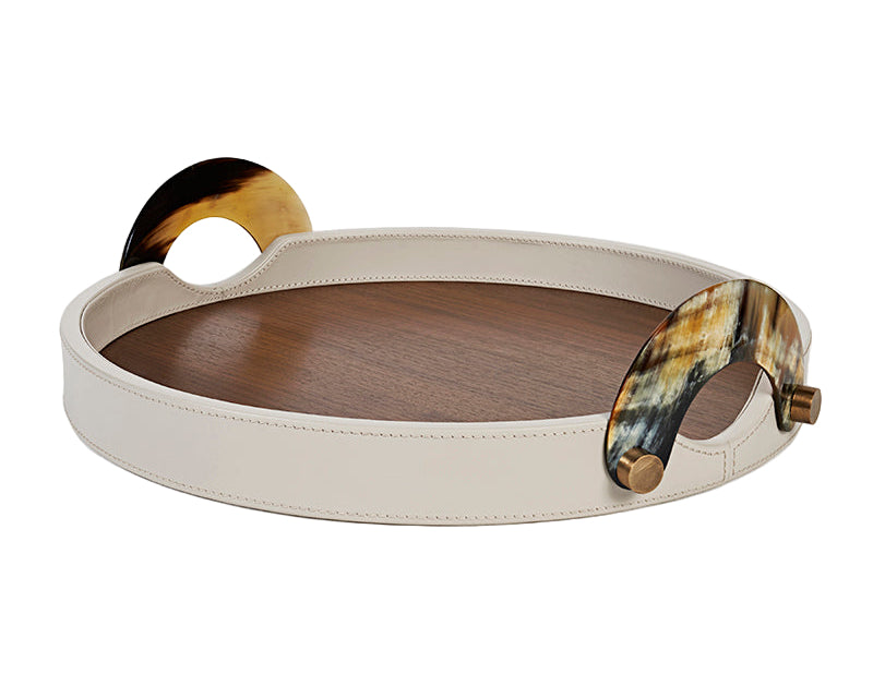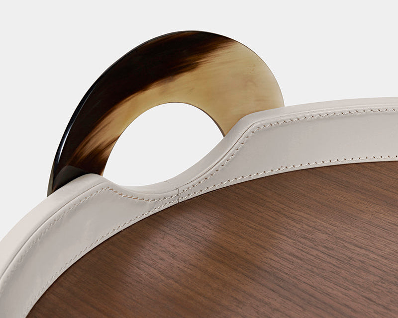 Elevate your living space with the Maeve Round Tray, featuring a top grain leather body with sumptuous walnut interior, opulent horn handles, and intricate brass detailing. Crafted with precision and sophistication, this tray seamlessly combines functionality with timeless elegance, making it a statement piece for those who appreciate the finest in craftsmanship and style.